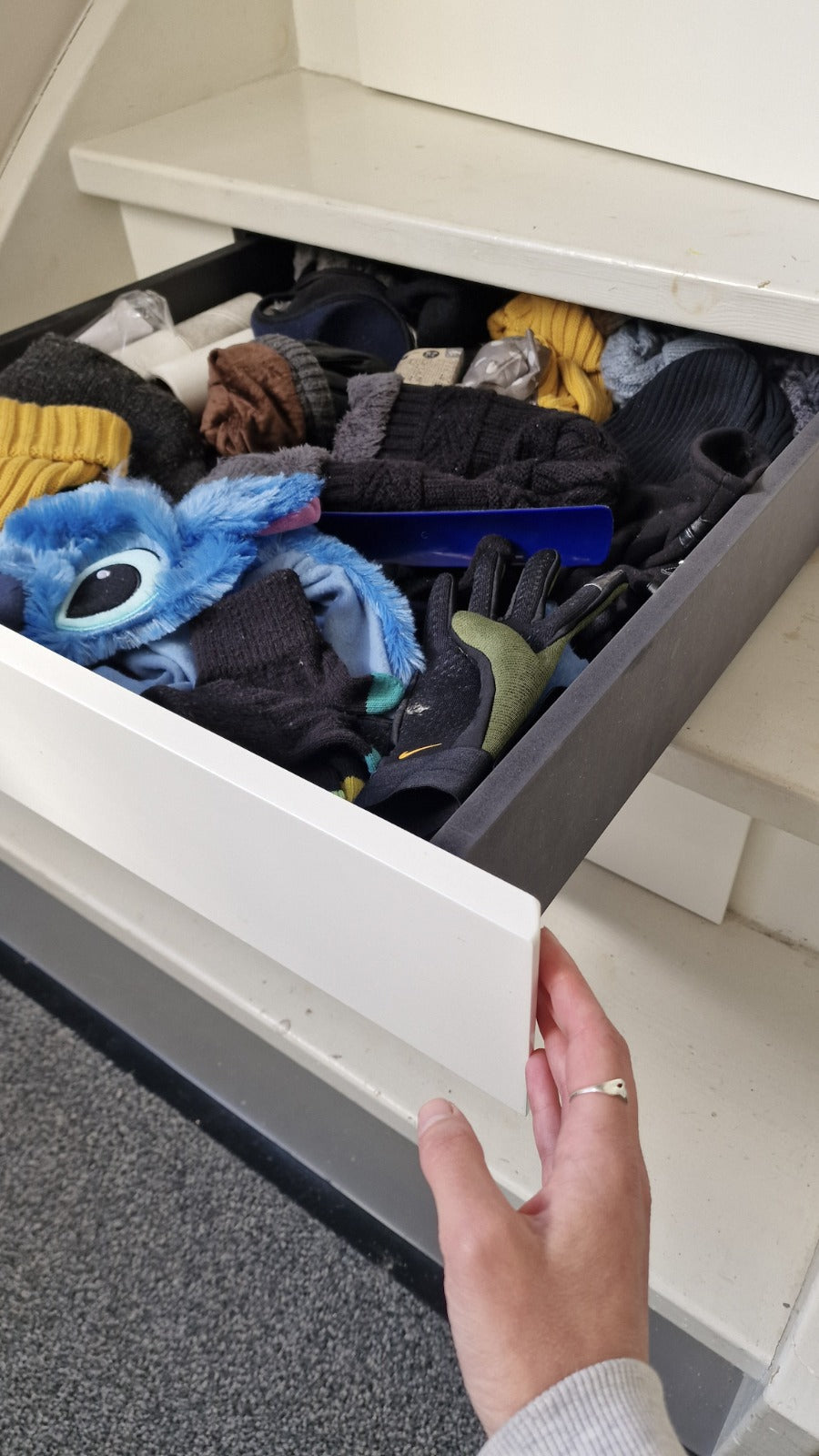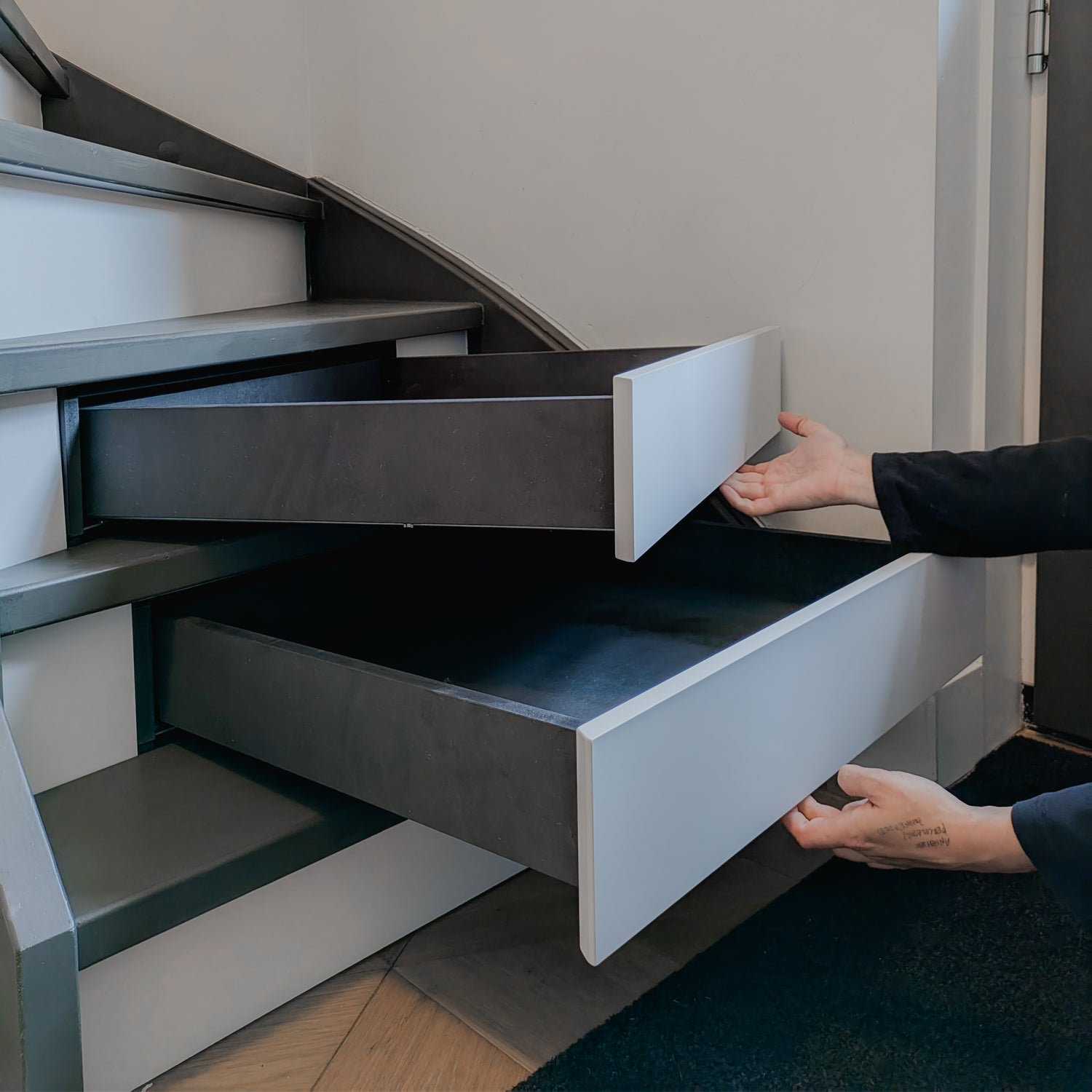 We installeren de treelades vanaf het tweede stootbord. Dit omdat we de lades onder een lichte neerwaartse hoek monteren, dan schuiven ze vanzelf weer dicht 🙌